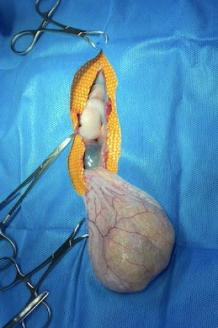 卵巣卵管摘出後、下腹部の結石を実際に目視し、膀胱内にあることを確認しました。